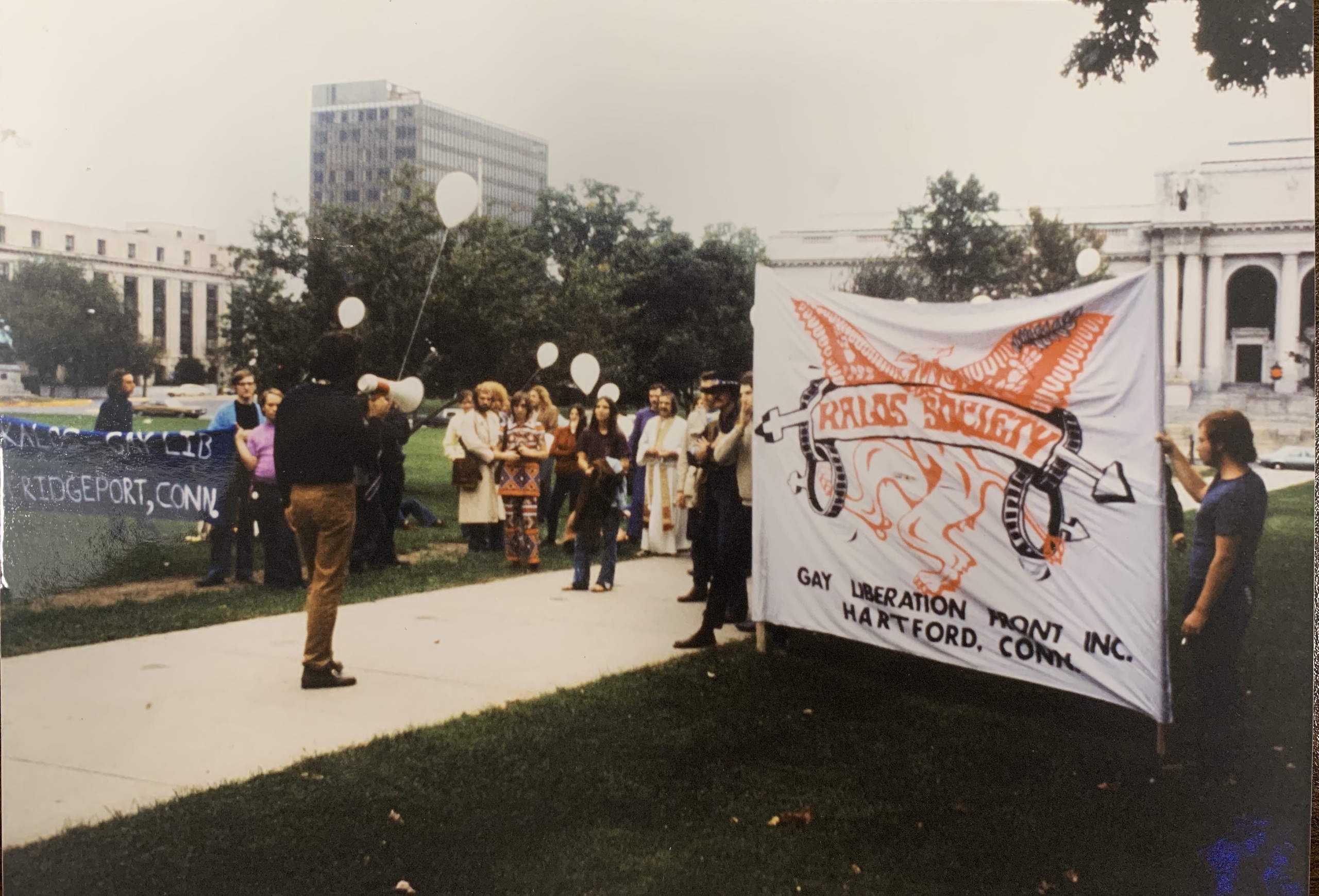 The Kalos Society was involved in organizing several social events and political protests throughout the state in the early 1970s. They also began publishing a newsletter called The Griffin, promoting events and legislative news. In 1971, Kalos Society attempted to host a picnic at Goodwin Park in the South end of Hartford. Locals protested the picnic with 400 residents signing a petition to prohibit the group from gathering at the park. The petition stated that “we feel that this group prohibits the natural law set down by God. We therefore request that the City of Hartford be enjoined from issuing a permit for the park for this group.”